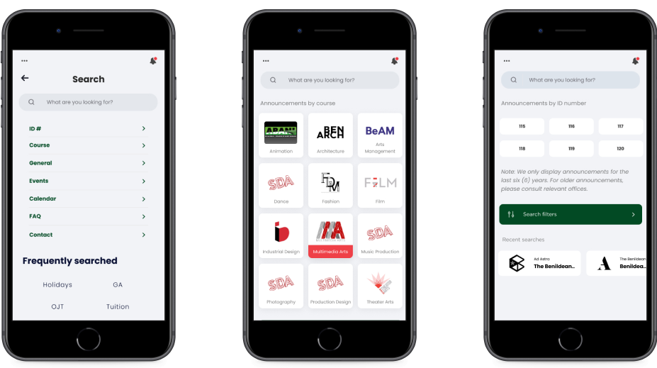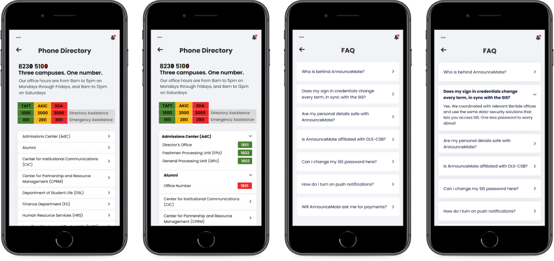 For questions relating to the app and the school, an accordion-style color-coded phone directory of campuses and a complementing FAQ page is accessible offline.