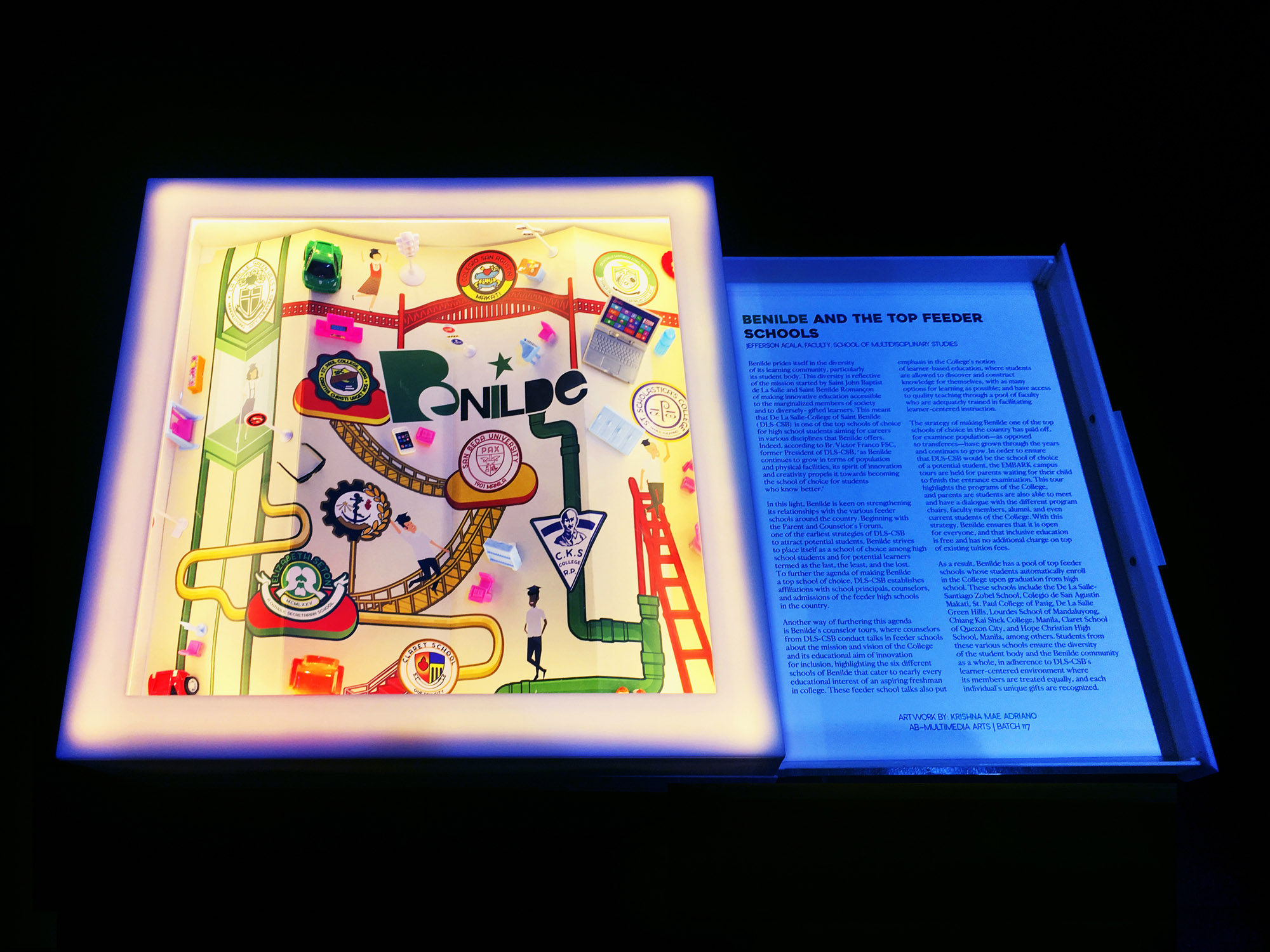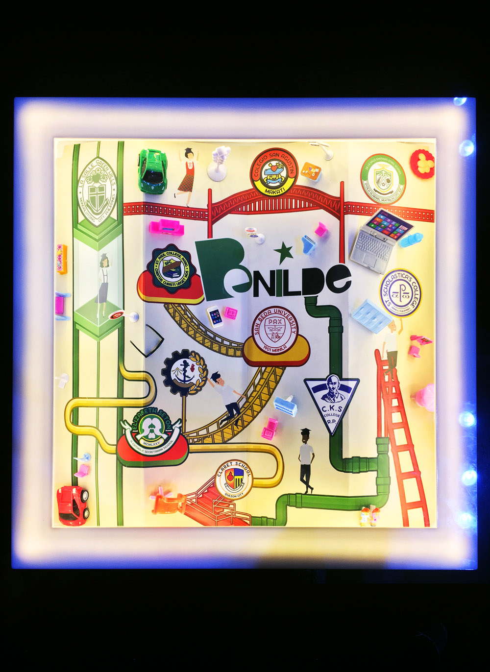 The core of the exhibit are 30 collage boxes featuring these community partnerships. Created by 30 students and alumni the commemorative boxes contain significant materials and information about the communities, highlight key Benildeans and their partners, and provide a narrative of the partnerships. A timeline listing down 150+ milestones of the College from 1988 to the present will be seen. Looking to the future, models of the three major buildings of Benilde presently being constructed and images of the newly opened Benilde Antipolo Campus and the proposed new Boracay campus completes the exhibit.