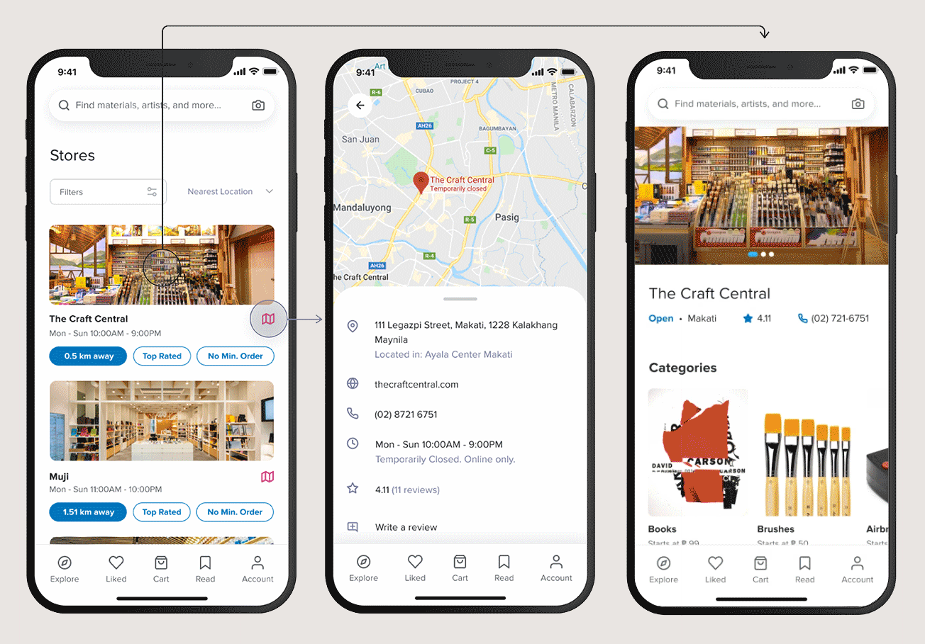 There are two ways to navigate the curated store list: via maps or an online shop. The map contains other links or store details that may provide more confidence and credibility to the shop.