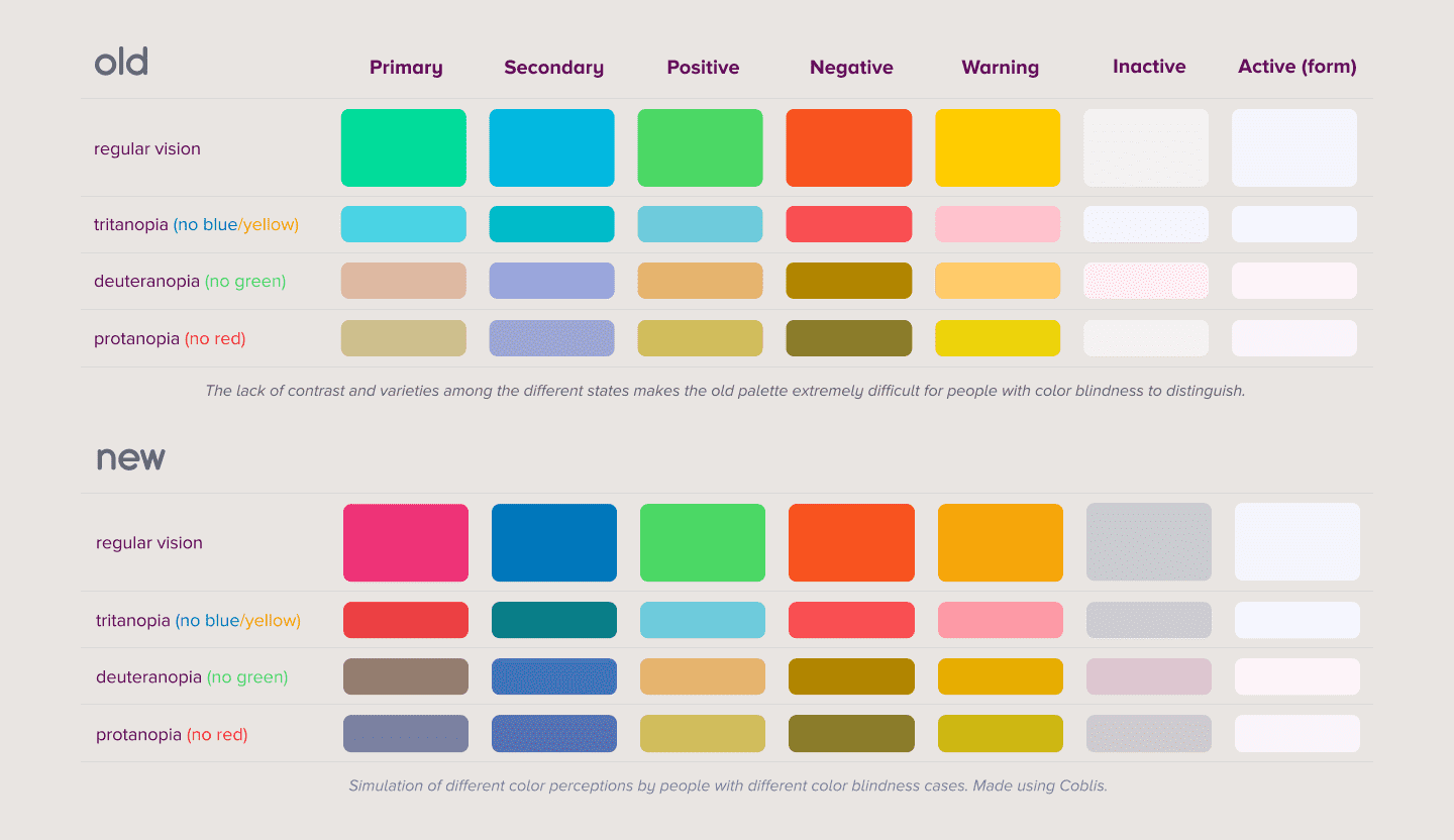 It is probably impossible to create a universal visual impairment/color blind-friendly palette, which means that the colors that I chose for this design are not bulletproof. This palette, inspired by the Okabe Ito color scale, has the primary goal of creating a more inclusive default for Dottie’s.