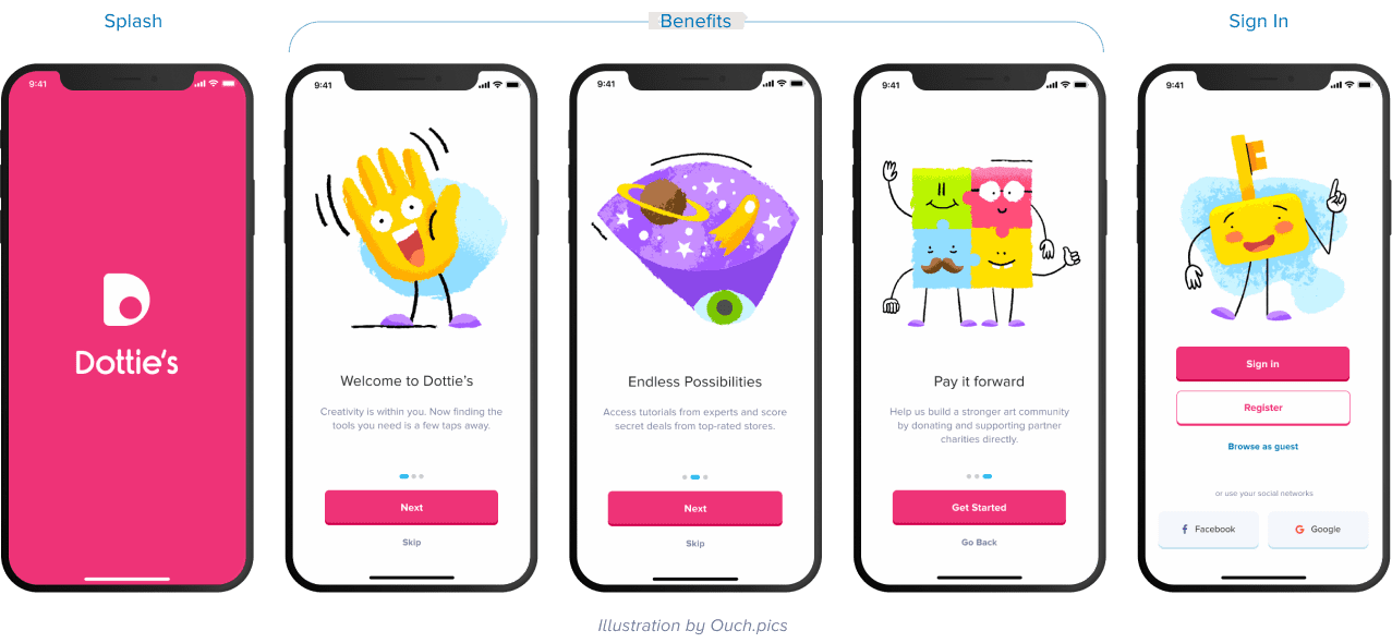 These onboarding pages use a benefits-oriented approach to encourage users to sign up. This part is vital since it allows Dottie’s to communicate why it would be of great value to its users.