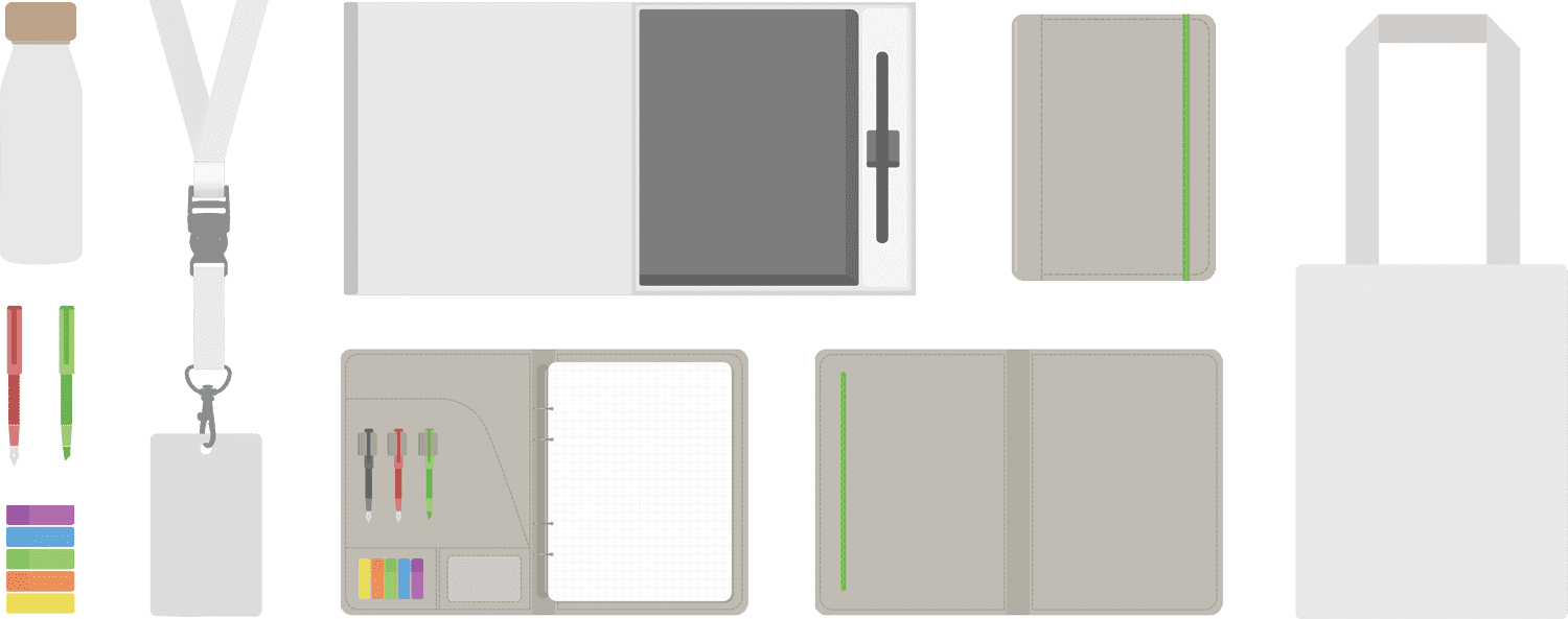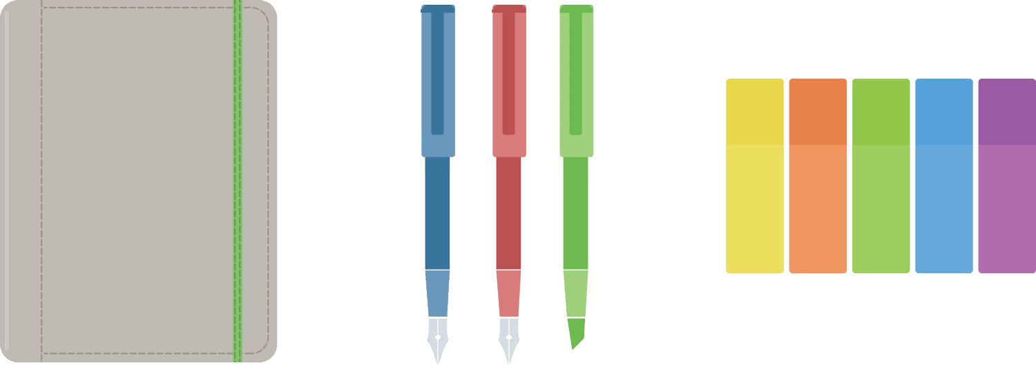 Notebook, Pens and highlighter, sticky notes